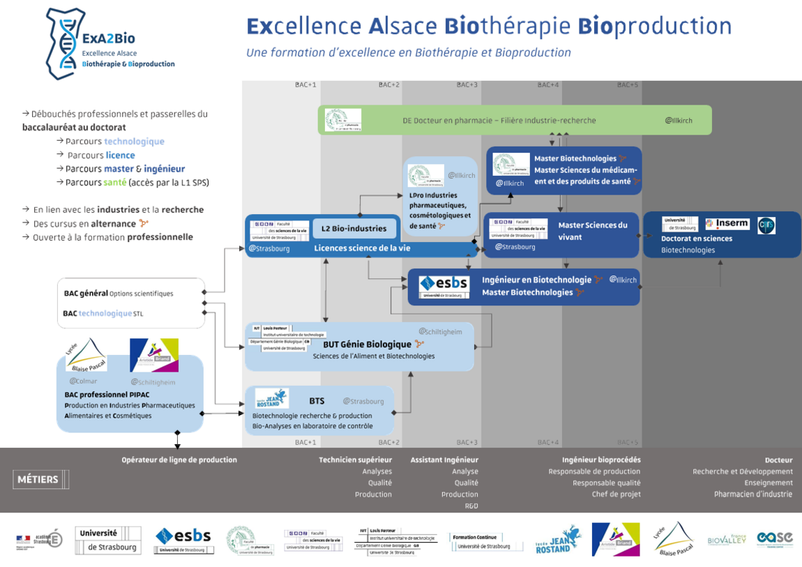ExA2Bio est un projet lauréat de l’appel à projets Compétences et Métiers d’Avenir (CMA), porté par l’École supérieure de biotechnologie de Strasbourg (ESBS) et son consortium.